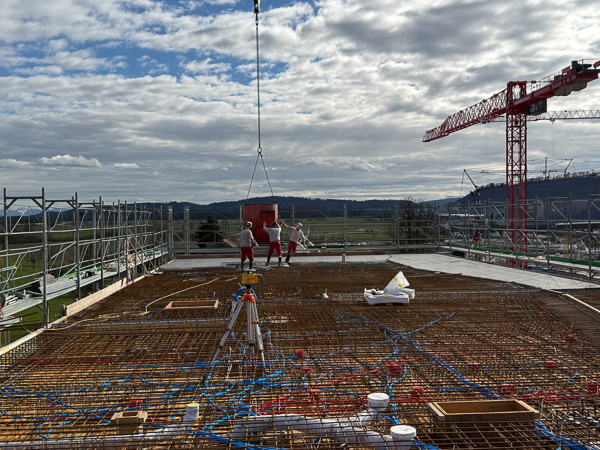 Es läuft das Betonieren der obersten Decke. Ein wichtiger Meilenstein ist mit Rohbauende bereits erreicht. Sogleich geht es los mit ersten Rohinstallationen.